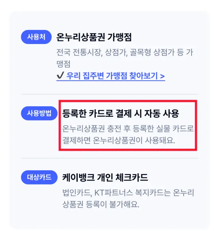 등록된 카드로 결제할 때 결제할 금액이 충전된 금액보다 작아야 자동으로 온누리충전금액에서 차감된다. 결제할 금액이 충전된 금액보다 크면 카드결제로 진행된다.