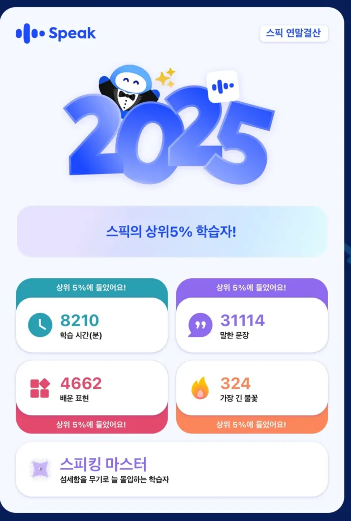 오늘 앱을 키니 스픽 연말결산이라고 해서 올해 내가 학습한 내용을 데이터로 알려주네요.