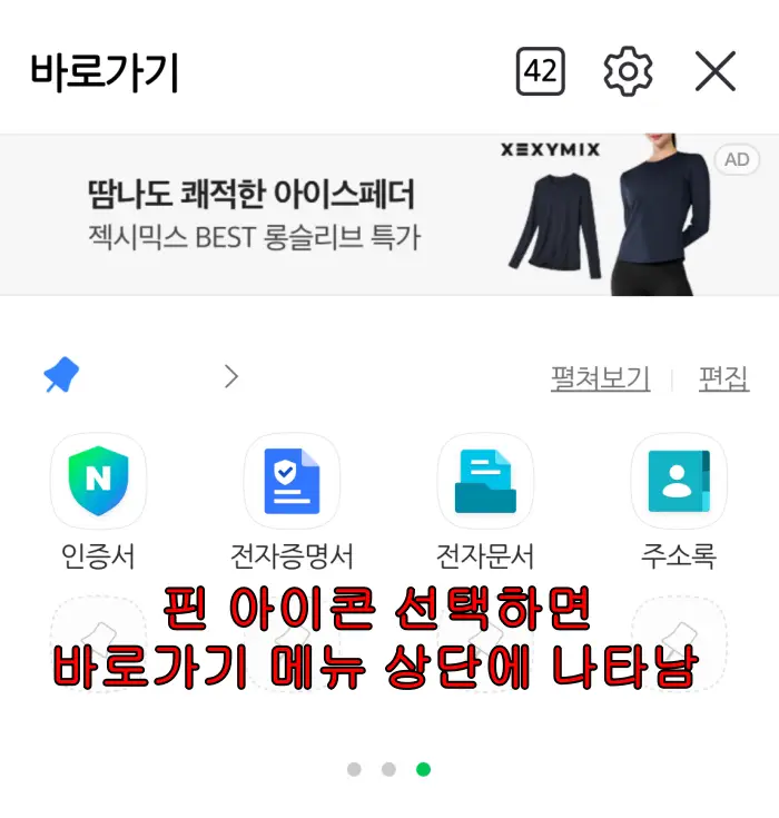 네이버는 다양한 서비스를 제공하고 있다. 좀전에 주소록에 핀모양을 선택해서 바로보기 상단에 아래와 같이 표시된다.