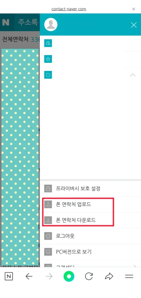 그러면 이렇게 전에 올린 주소록이 나타난다. 이번에는 우측상단에 있는 석삼자 아이콘을 선택하면 아래화면처럼 폰연락처 업로드, 다운로드 메뉴가 나타난다.