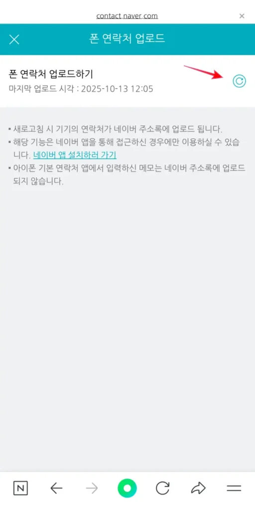 업로드를 선택한다. 그러면 아래화면처럼 나오는데 오른쪽 동글뱅이 아이콘을 선택하면 현재 핸드폰에 있는 연락처가 업로드 된다.