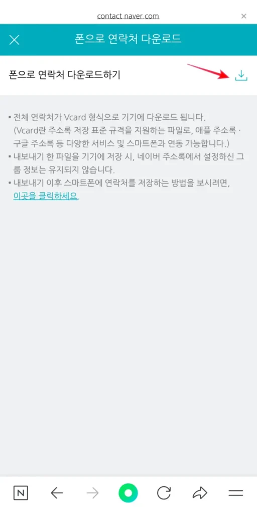 현재 해당기기에 바로 다운로드할수도 있고 다른 곳에서도 사용할수 있는 형식으로 연락처 파일을 다운로드 할 수 있다.