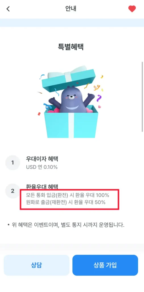 주의점은 외화를 살때는 환율우대가 100%이지만 재환전해서 원화로 바꿀때는 환율우대가 50%라는 점이다.