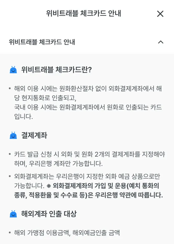 우리카드 위비트래블 체크카드를 만드려면 우리은행계좌와 외환계좌를 먼저개설해야 한다.