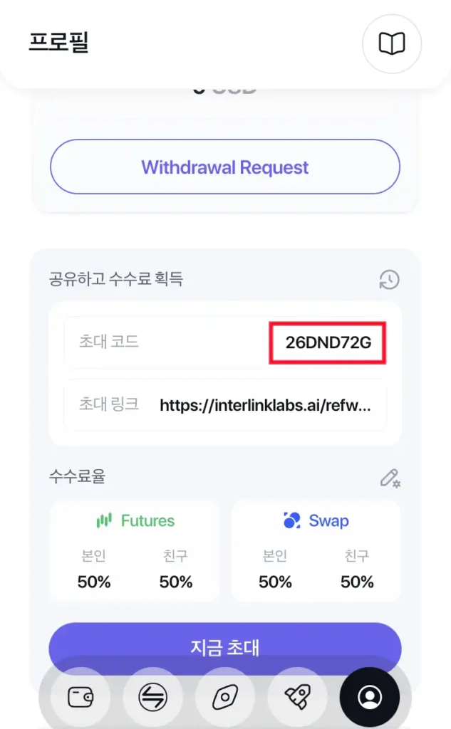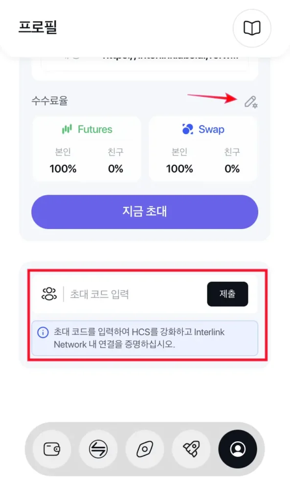 지갑 초대코드를 입력하면 좋습니다. 초대코드입력란에 입력합니다.