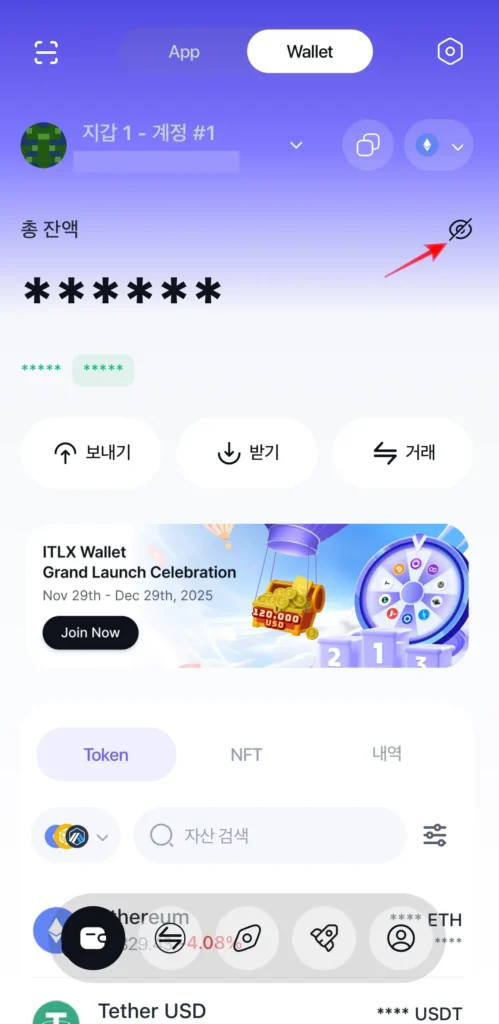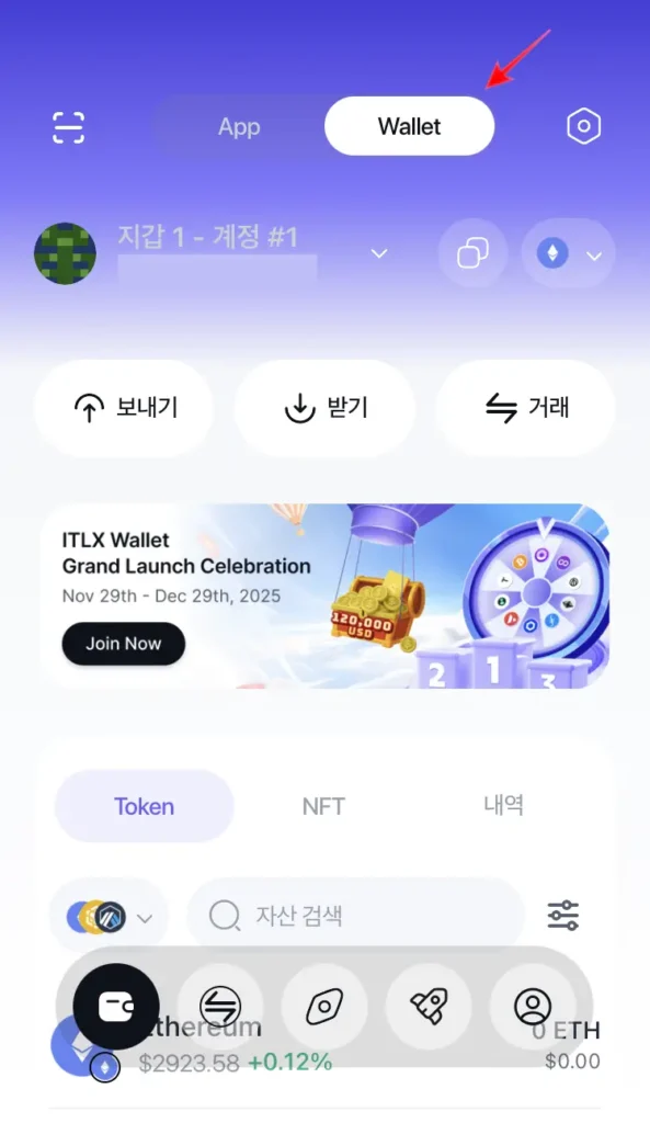 인터링크 앱을 실행시 홈화면에서 상단에 있는월렛 Wallet을 선택합니다.