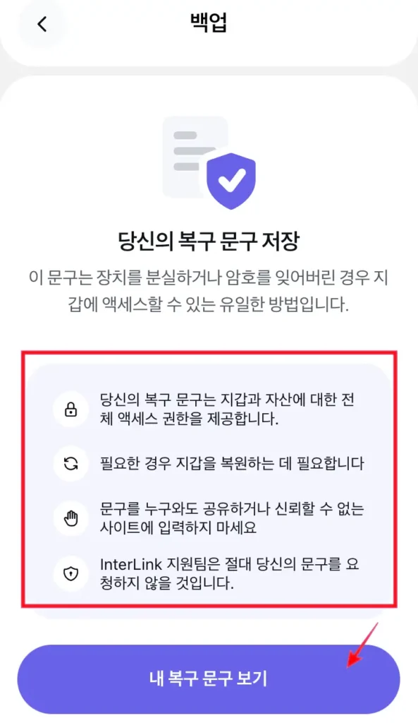 백업에서 내 복구 문구보기를 누르면 니모닉 12단어가 나옵니다.