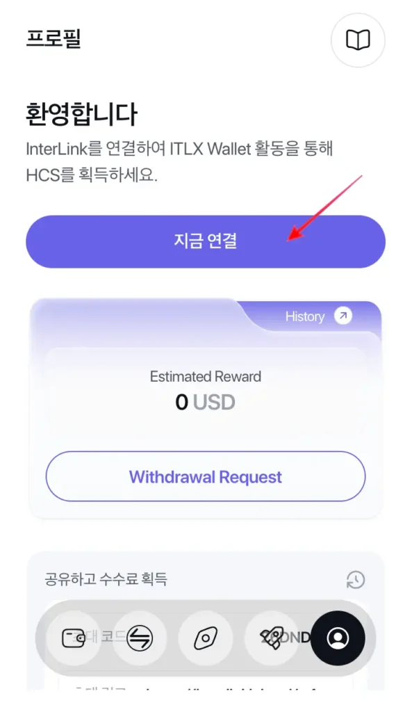 맨아래에 오른쪽 프로필을 선택후 이제 월렛과 내 인터링크 아이디를 연결하면 끝!