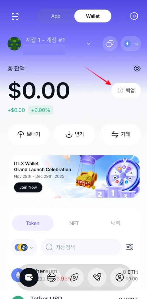 아래화면처럼 잔액 옆에 백업이라는 메뉴가 있습니다.