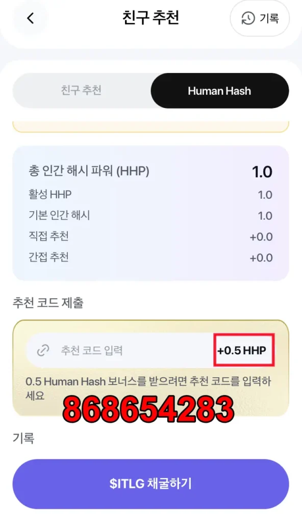 친구추천 메뉴에서 추천인 코드를 입력합니다.