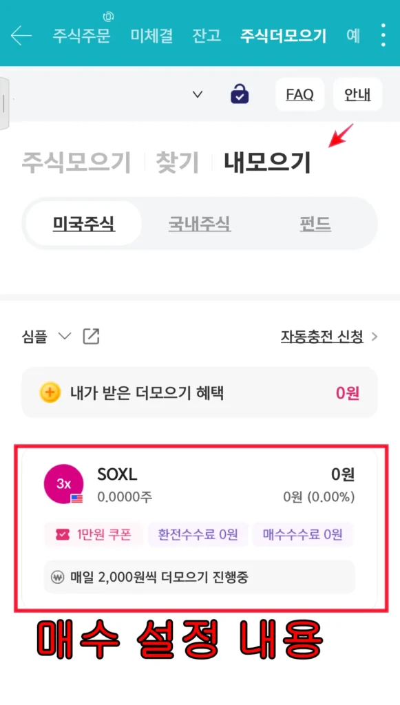 국내주식>주문>주식더모으기 메뉴에서 진행하면 됩니다.
